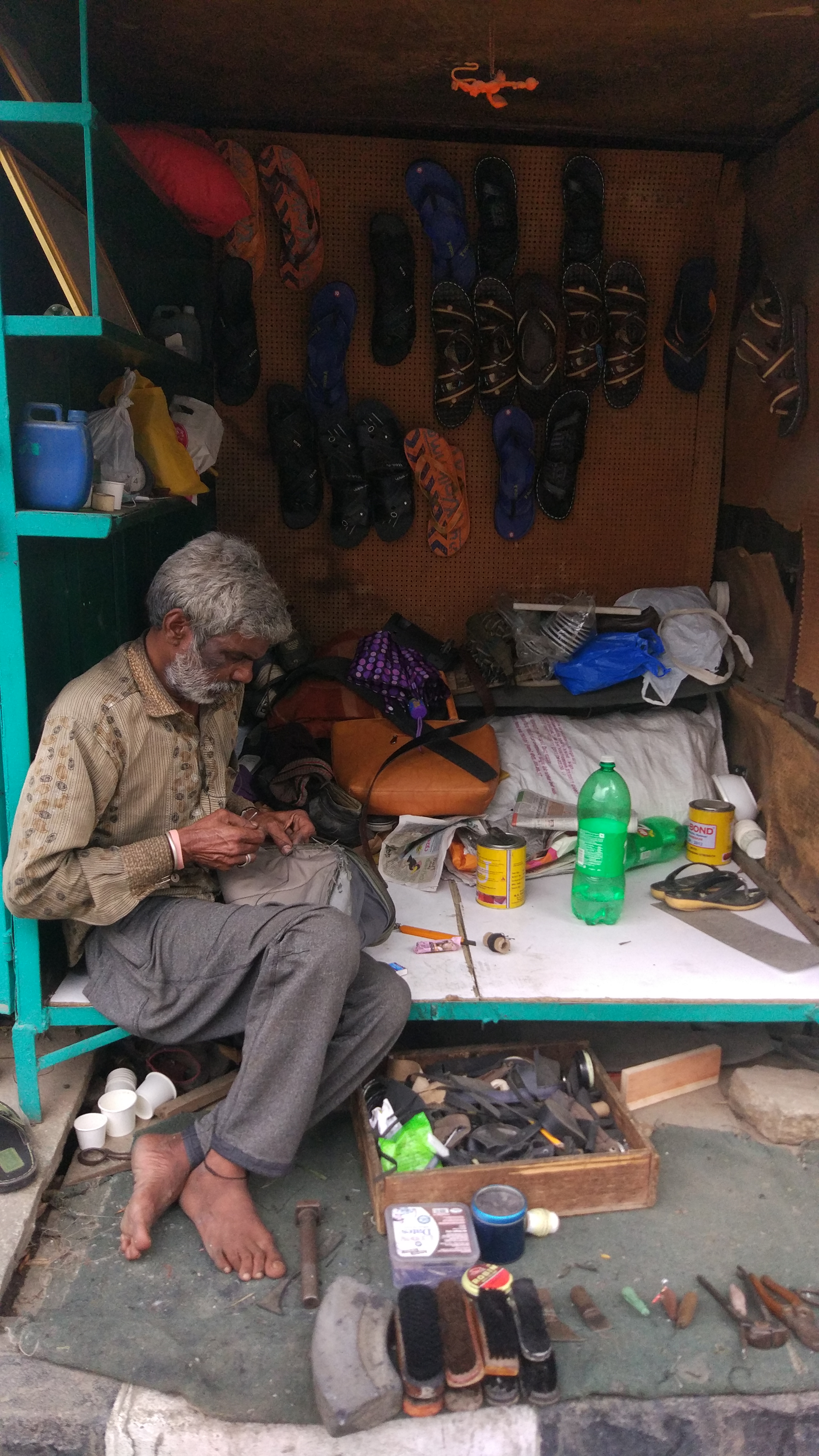 This photo depicts a cobbler at his regular mending work. He could have easily begged for money, but NO it was unacceptable to him, he would eat with only the money he has earned. This portrays his true will power and determination. He believes that he will work hard with the blessings of god over him and achieve success.